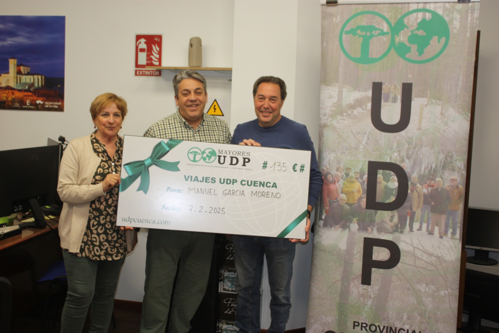Manuel de Navalón ( Cuenca) es el ganador del cheque «Viaje Gratis » de los Viajes Udp Cuenca, entregan el premio el Presidente Provincial Justo Mora y la responsable de Viajes Dolores Perez.